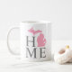Na moda personalizada caneca de café apresenta um design de tipografia com texto "Home" e mapa do estado de Michigan. Clique na opção Personalizar para mover o marcador da cidade do coração branco em ambos os lados da caneca. Você pode posicioná-la diretamente sobre a cidade onde você mora ou sobre a sua cidade natal. Cinzas de carvão, cor-de-rosa e branca.