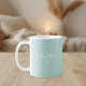 A modern minimalist personalized mug featuring a muted teal background, clean white lettering, and a subtle heart accent. Customized with a name, this design offers a calm, contemporary take on Valentine’s Day gifting while remaining perfect for everyday use.