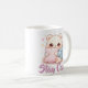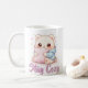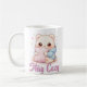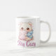 Mochi Cuddle Bear coffee mug featuring a cute kawaii character with big glossy eyes hugging a pillow. Perfect cozy gift for kawaii and bear lovers.