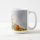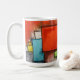 “This modern abstract geometry design turns a simple mug into a statement art piece. Glowing orange, teal and yellow rectangles float over a misty gray background, framed by loose, hand-drawn lines that suggest movement, energy and creativity. The composition feels like a city skyline reimagined as minimalist art.