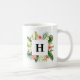 Adicione um sotaque de verão à sua cozinha com esta caneca de monograma tropical. Apresenta cor d'água uma estrutura floral de hibisco, plumeria, folhas de monstera, palmeiras, bananeiras e outros sotaques tropicais. Personalize adicionando seu próprio monograma. Esta caneca floral tropical será um presente personalizado perfeito.