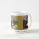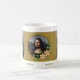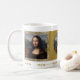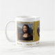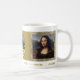 Café de Arte Italiana Vintage Mug apresentando famosa pintura "Mona Lisa" de Leonardo da Vinci, sublinhada com o antigo fundo decorativo de tecido rústica.