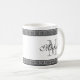 Caneca de café feita sob encomenda do monograma da beira chave grega do teste padrão do meandro. Criar seu próprio copo monogrammed com a fricção preto e branco à moda e tipografia elegante do roteiro. Favor bonito de presente ou de festa de casamento de aniversário para homens, mulheres, amigos e família. Mercadorias feitos sob encomenda da bebida para a casa, o escritório, o trabalho, o restaurante, a escola etc. Também disponível como grandes canecas desproporcionados e grande para ir canecas de viagem. Faça um para os noivos, o professor, a enfermeira, o chefe, o trabalhador do co, o melhor amigo, a mamã, o pai, o tio, a avó, o vovô etc.