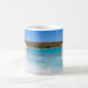 Uma caneca com fotografia de uma praia na ilha grega Creta. Uma bela praia azul tropical com surf de espuma. Um maravilhoso destino de viagem tranquilo.