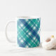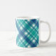 Esta caneca apresenta um padrão de xadrez diagonal azul-escuro e tenra. Um diamante branco, no centro, oferece um monograma personalizado.