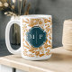 Adicione um pop de sol ao seu café matinal com a nossa caneca de café amarela com padrão floral corajoso, ao estilo do monograma. A maneira perfeita de iluminar seu dia e mostrar seu estilo único. Personalize com as iniciais do monograma. Ilustração projetada pelo artigo de Moodthologia.