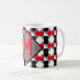 Quando o clássico retrorvintage inspira a arte moderna, esse padrão de quadrados geométricos vermelhos e pretos é inspirado pelo estilo de xadrez de búfalos e louros antigos, com um toque de uma geometria de abstrato de memórias em um padrão estético para formar um padrão decorativo na moda e elegante composto de blocos coloridos de geometria em vermelho e preto e branco para dar uma decoração agradável numa caneca de café. Este design pode ser facilmente personalizado com monograma personalizado Inital para ser o melhor presente de aniversário e feriados únicos presentes para o natal para o novo fã de padrões vermelhos e negros para uma arte decorativa.