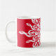Canecas de café com tema musical exclusivas para músicos e amantes de música nas férias de inverno. Derreter clefs brancas formam um floco de neve feito de notas de clef triplas. Use o modelo de texto para adicionar um inicial ou um monograma ao meio do design ornamental. Edite para mudar o fundo vermelho natalino, a borda do círculo central e a fonte elegante e antiga para qualquer cor que desejar. ♡ Idyllfire