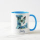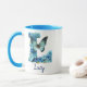 Uma caneca de café personalizada em tons de azul com borboleta coordenada, apresentando o monograma da letra "L". Personalize facilmente com seu nome ou crie um presente único para seus entes queridos. Espaço suficiente para adicionar uma citação ou mensagem adicional ou até mesmo um fundo. Esta caneca também vem em diferentes estilos e combinações de cores. Navegue pela coleção para ver exemplos deste tipo de fonte nos diferentes estilos e tamanhos de xícara.