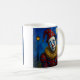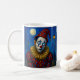 O palhaço de Pierrot, estilo porcelana brilhante, com fantasia vermelha de ponto polca sob a rua lua na caneca, ideal para colecionadores ou presentes artísticos. Esta caneca única apresenta um palhaço de pierrô brilhante no estilo porcelana contra uma rua iluminada pela lua. Com uma expressão dolorosa, colírios pintados, e um nariz vermelho brilhante, o palhaço veste um chapéu pontiagudo e um colar ricamente texturizado. Sua fantasia vermelha com bolinhas azuis brilha sob a luz, reforçada por um efeito cerâmico liso que dá vida a todos os detalhes. Perfeito para café, chá, ou como peça decorativa, esta caneca faz um presente marcante para colecionadores de arte, entusiastas de circo, ou qualquer pessoa que ama designs teatrais e modernos.