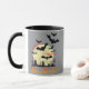 Uma caneca de café que diz "Pausa da Rotina" com uma imagem de Halloween de morcegos voando de uma cidade em frente a uma lua brilhante é um design divertido e assustador, frequentemente usado por aqueles que buscam uma pausa de sua rotina diária. Sugere um desejo de escapar dos estresses da vida cotidiana e abraçar um estilo de vida mais aventureiro ou emocionante.