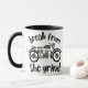Uma caneca de café com uma motocicleta retrô monocromática, com a frase "Quebre a Rotina" centralizada em torno da imagem. O design sugere um senso de aventura e liberdade, oferecendo uma fuga pacífica da rotina diária.