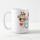 Mug apresenta uma ilustração fofinha de animais florestais divertidos contra um fundo cardíaco cor-de-rosa macio.