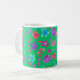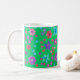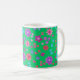 Uma bonito caneca de café floral, com um padrão de flores brilhantes em roxo, turquesa, rosa e laranja sobre fundo Jade Green, a partir de uma colagem de papel pintada à mão por Judy Adamson. Você pode mudar facilmente a cor do plano de fundo, se desejar, usando o botão Editar.