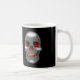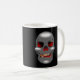 A design mostra um crânio ralado com buracos de olhos vermelhos, uma cavidade vermelha para o nariz e partes de uma boca vermelha com alguns dentes de cinza acastanhada. O crânio é colocado sobre um fundo preto. Você pode mudar facilmente a cor do fundo e adicionar suas próprias palavras clicando no botão "personalizar".