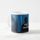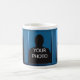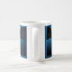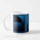 Um design gráfico de golfinhos no fundo do oceano azul pelo artista/designer Charmaine Paulson em uma caneca de café. A caneca tem um quadro para sua foto.