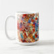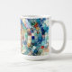 A imagem é um trabalho de arte de mosaico colorido que apresenta um padrão intrincado de formas e linhas giratórias. O design inclui uma variedade de cores, como azul, verde, amarelo, laranja e vermelho, criando um efeito visual dinâmico e vibrante. As peças do mosaico são dispostas de uma forma que forma um padrão fluente, quase floral, com elementos circulares e espirituais. A trabalho de arte é visualmente cativante devido à sua complexidade e à mistura harmoniosa de cores.