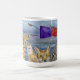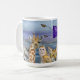 Mug with watercolor collage of Joanna flying over animals. Dark blue painted back ground