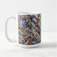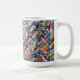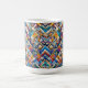 A imagem é um trabalho de arte de mosaico colorido que apresenta um padrão intrincado de formas e linhas giratórias. O design inclui uma variedade de cores, como azul, verde, amarelo, laranja e vermelho, criando um efeito visual dinâmico e vibrante. As peças do mosaico são dispostas de uma forma que forma um padrão fluente, quase floral, com elementos circulares e espirituais. A trabalho de arte é visualmente cativante devido à sua complexidade e à mistura harmoniosa de cores.