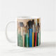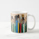 Fotografia de uma fileira de pincéis coloridos e variados. Imagem em ambos os lados da caneca.