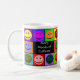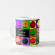 Esta caneca caracteriza 10 caras felizes coloridas que cercam a frase "muitos humores da cafeína" impressa em lados para esquerdista ou em righties!