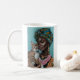 Pintura colorida de uma mulher negra vestindo roupas e joias com padrão africano. Segurando seu lindo gato