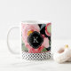 Uma bela caneca de café com apelo na moda-feminino, esta design apresenta pedras cor-de-água rosa sobre um fundo preto contrastante. Um padrão de bolinhas preto e branco corre sobre a parte inferior da caneca para uma aparência de designer. Edite o monograma de amostra em ambos os lados desta caneca com o seu próprio texto inicial ou outro.