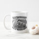 Esta engraçada caneca de geologia retrata um geólogo de desenho animado em preto e branco, retrô, estilo de desenho animado dos anos 30-40. Feliz Sr. Sun está brilhando no deserto com uma pequena nuvem feliz e algumas pedras alegres olhando para cima, enquanto um geólogo feliz, sortudo, sai para o campo com seu martelo de rocha e lentes de mão! O texto da cinza na caneca diz "Não se preocupe! Sou geólogo!" Avise as pessoas que estão em boas mãos quando você estiver por perto!