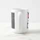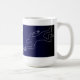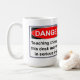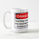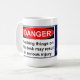 PERIGO! As coisas tocantes nesta mesa podem conduzir a ferimento sério! Caneca engraçada do escritório com um sinal de aviso em um lado e no outro uma imagem de um esboço do corpo no giz que toca no esboço de um grampeador no giz. Os inclinações do fundo de azul escuro ao preto a aparecer como um passeio com uma cena do crime…