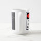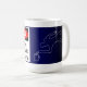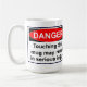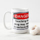 Perigo! Tocar nesta caneca pode conduzir a ferimento sério. Caneca engraçada com um sinal de aviso em um lado, e o esboço de um corpo que encontra-se no giz que toca no esboço de uma caneca no giz no outro. O fundo é um inclinação de azul escuro a enegrecer. Grande presente do escritório!