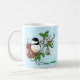 Um grão bonito sentado num galho de árvore no inverno, com flocos de neve caindo por toda parte. Os enfeites de natal estão pendurados no galho da árvore em que está sentada a galinha.