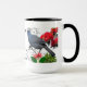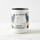 Uma caneca de café com um mapa norte da ilha, da Nova Zelândia, as flores de Pohutukawa (árvore nativa), uma samambaia e um kokako (pássaro nativo)
