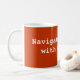 Uma caneca branca e laranja com texto branco lendo "Os navegadores fazem isso com o mapa".