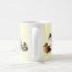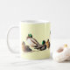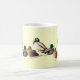 Nove patos-reais decoram esta linda caneca. Os machos têm cabeças verdes iridescentes, a maioria corpos brancos e bicos amarelos. As penas das fêmeas são tons de marrom e ouro com bicos de laranja. Colocado sobre um fundo cremoso com uma borda verde que combina com a plumagem masculina, este é um design impressionante!