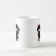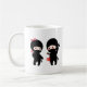 O adorável garoto ninja vestido de preto está esbranquiçado enquanto segura um coração de papel origami atrás de suas costas e olha para uma linda ninja, vestida de preto, mas para um arco rosa em cima de sua cabeça. A maçaneta da espada de katana também é cor-de-rosa.
