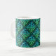 Uma caneca com design de um nó celta azul-esverdeado de diamante contra um fundo preto.