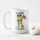 No Kings Frog with American Flag standing on a crown anti trump protest coffee mug. Make a political statement with this Democrat Anti-Trump coffee cup.