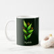 Caneca da planta verde com um desenho decorativo da aguarela de uma planta verde abstrata bonita com folhas do sharp e nome alaranjado do baga e o customizável.