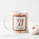 Esta caneca de monograma é uma forma excelente de adicionar um inesperado à sua rotina matinal. Um padrão geométrico cor-de-rosa e coral aparece contra um fundo creme. A letra "W" aparece em um quadrado junto com o nome da família. A carta e o seu nome podem ser personalizados rápida e facilmente. Design original - C. McGouldrick