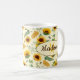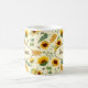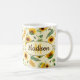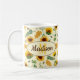 Nome personalizável e caneca monográfica com um impressão de girassóis pintados de jardim e abelhas produtoras de mel, cor amarela e verde.