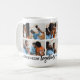 Crie sua própria caneca de café de colagem de fotos de primeira Dia de os pais especial. Apresentando 10 imagens quadradas no estilo instantâneo com o texto 'Nosso Primeiro Dia de os pais Juntos', a palavra em conjunto está em um roteiro moderno, dois corações azuis bonitos que podem ser mudados para qualquer cor, uma mensagem doce que você pode manter ou mudar e nome/s. Todo texto pode ser personalizado em tamanho, fonte e cor.