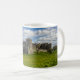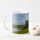 A linda caneca mostra fotografias cênicas de nuvens flutuando sobre o icônico Castelo Carew, Pembrokeshire, Wales.