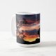 O fim da trilha em silhueta na caneca de café do pôr do sol