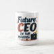 Este design vibrante e motivacional apresenta o texto ousado "O futuro CEO no Fazer" rodeado por uma matriz dinâmica de estrelas e um som circular. A palavra "CEO" é destacada em letras grandes, chamadoras de olhos, com uma mistura de cores vermelha e azul. Abaixo do texto, há uma ilustração de uma pasta com uma pena e um diploma enrolado com fita vermelha, simbolizando ambição, educação e sucesso profissional. Esta caneca é perfeita para inspirar e celebrar futuros líderes e empreendedores.