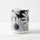 Esta imagem mostra um aglomerado de margaridas com pétalas brancas e polos púrpuros-azuis em greve. O fundo e a folhagem estão em preto-e-branco, criando um efeito colorido seletivo que enfatiza as cores vívidas dos centros das flores. O contraste entre os arredores dessaturados e as delicadas flores dá à imagem uma qualidade artística, quase surreal, destacando a beleza e a complexidade da natureza.