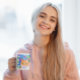 Branca de trigo, cor d'água, gato laranja e xícara de café com flores azuis e roxas. Citação, "Gatos são minha tribo", conteúdo genérico.