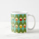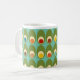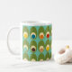 Esta caneca tem um design moderno de meados do século de ovais verdes com ovais e círculos dentro deles, fazendo com que pareçam ovos em cores retrô como vermelho, amarelo, azul, verde, marrom e laranja em um campo de azul claro.