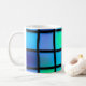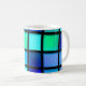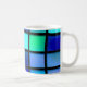 Esta caneca tem um padrão quadrado de arte nela.