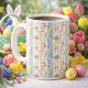 Caneca de Páscoa com Listra Pastel • Bunnies, Chicks, Ovos e Florais de Primavera Uma alegre padrão de Páscoa com coelhinhos brancos, pintinhos amarelos, cestas de ovos, laços cor-de-rosa e florais de primavera dispostos em listras verticais repetidas para um visual brilhante de temporada.