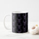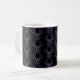 Um padrão final geométrico que lembra riachos de renda. Em roxo sobre fundo preto.